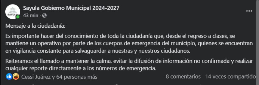Mientras en redes sociales circulan versiones sobre presuntas “narconóminas” y posibles vínculos entre corporaciones municipales y el crimen organizado en la región sur de Jalisco, el Gobierno Municipal de Sayula publicó un mensaje institucional llamando a la calma.